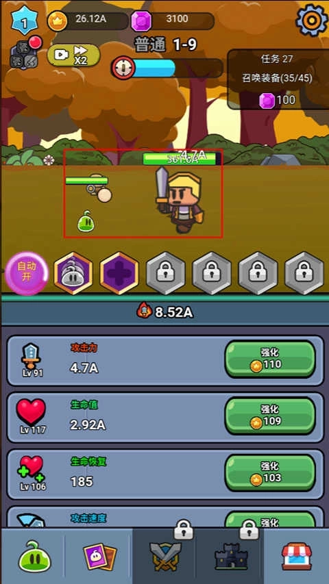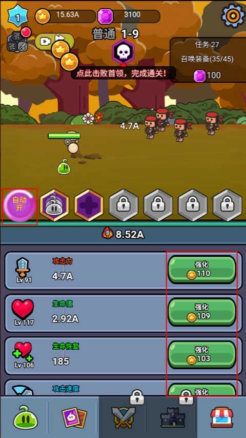 消耗金币就能强化生命、攻击、防御这类基础属性,开启自动战斗功能后,史莱姆会不间断发起攻击,不需要玩家手动操作。