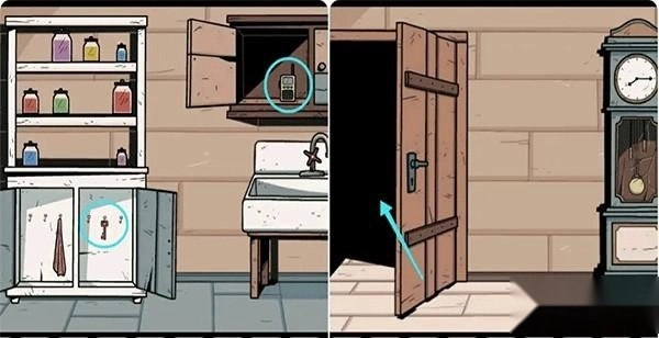 2、推开那扇蓝色的门进入盥洗室,依据照片上的提示来摆放架子上的罐子,完成这一步后取走下方的钥匙,随后打开水池上方的柜子拿到对讲机,再出去用钥匙打开钟表左侧的门。