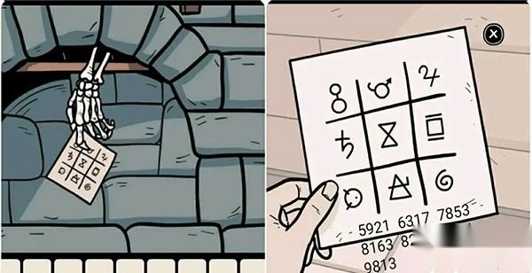5、走到壁炉处,掀开画框上的白布,随即触发剧情。之后,用对讲机对着壁炉操作,会收到一张纸条。仔细查看纸条上的符号,再结合收音机的频道数字,就能得到四个符号组成的密码。