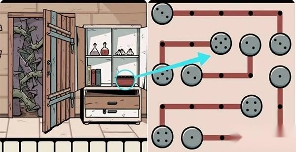 6、输入符号密码打开正大门右侧的柜子,接着点击右下方的红色盒子完成其上的机关(连连看),就能获取里面的白色宝石。