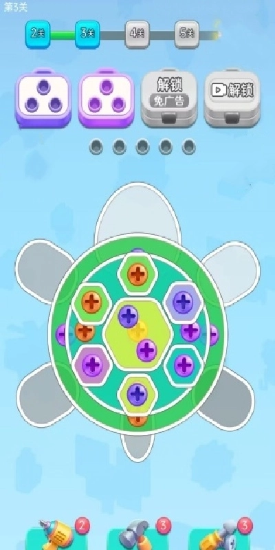 3、游戏后期关卡会设置锁链、固定螺丝这类障碍,玩家需要优先处理掉障碍螺丝,以此来拓展可操作的空间。
