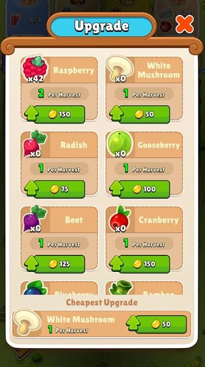 6.游戏的整体玩法就是根据上方的觉得所需要的水果,然后进行种植回收,直至完成任务获得金币。
