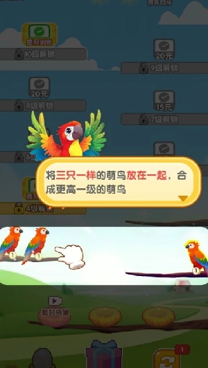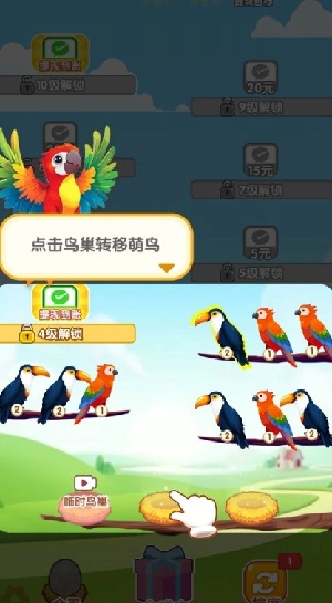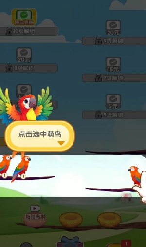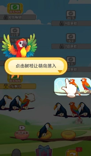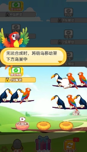 2、萌鸟的等级越高,得到的奖励就越多,并且只有相同等级的萌鸟才能停在同一个树杈上。