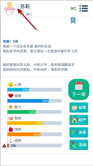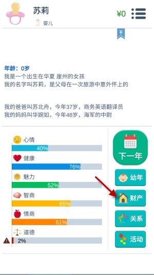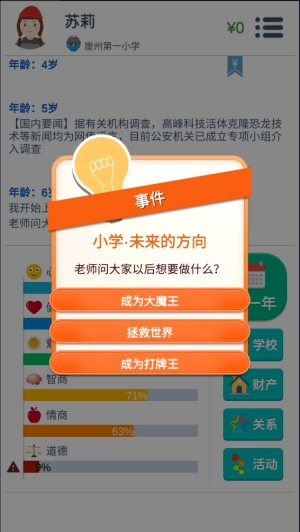 3、当没有其他可以操作的时候,我们可以点击下一年,会随机出现各种事件,例如在6岁的时候就会开始上学。