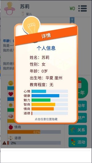 《第二人生》是一款休闲有趣的人生模拟器游戏,它以文字为载体,让你沉浸式体验一段全新的人生旅程。游戏中,你将从呱呱坠地的婴儿阶段开启,一年又一年地经历成长过程中的点点滴滴。在童年、少年、青年等不同的人生阶段,你都会面临各式各样的选择,而每一次选择都将影响你未来的人生轨迹——是成为教书育人的老师、能言善辩的主持人,还是万众瞩目的明星?这些都由你自己做主,只要投入足够的精力去追求,就有机会实现心中的目标!你准备好书写属于自己的精彩人生篇章了吗?