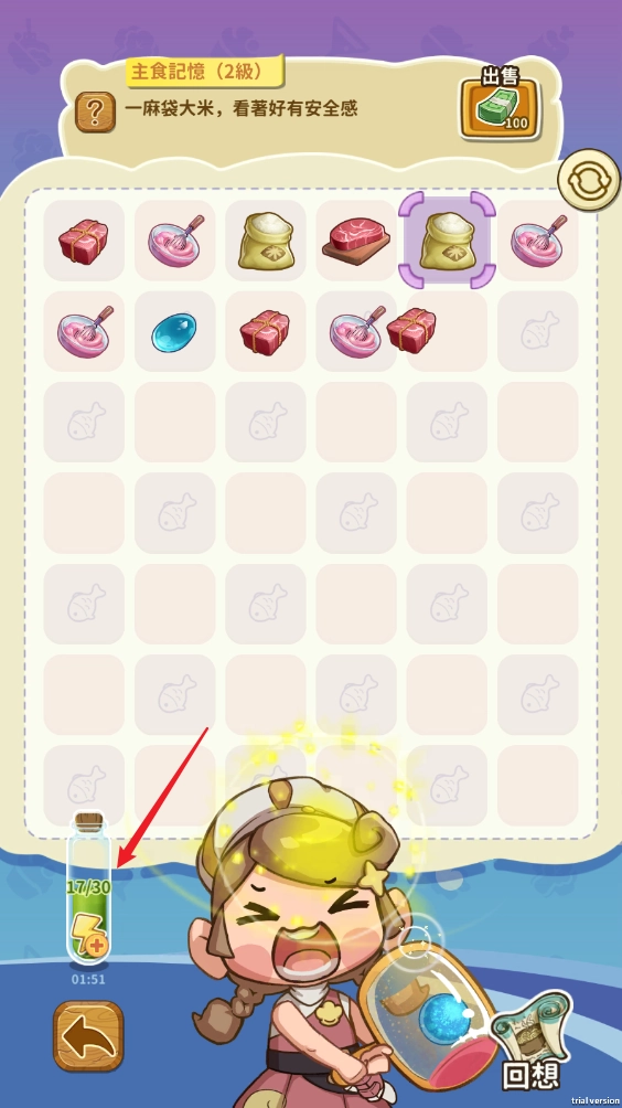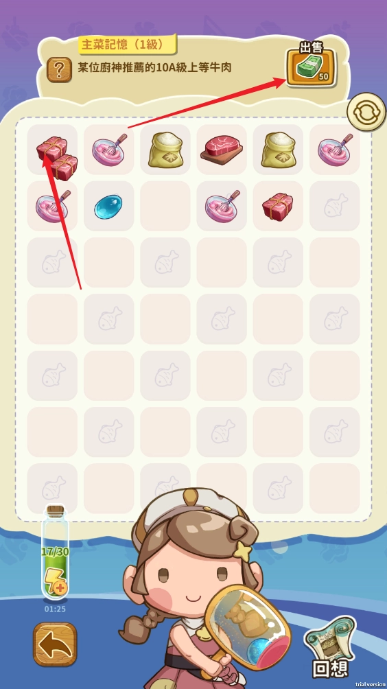 7、通过拖动相同物品进行合成就能得到高阶食材,售卖就能获得更多资金。