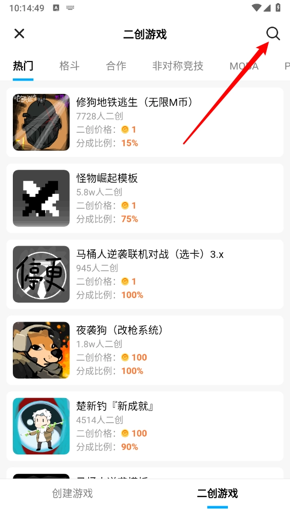 4、还可以切换至"二创游戏"界面,点击右上角搜索框。