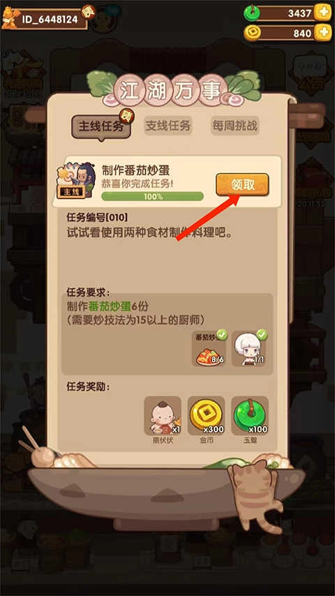 7、进入任务界面,包括主线任务、支线任务和每周挑战,可看到当前的任务的制作番茄炒鸡蛋,还有任务要求和任务奖励,点击【前往】选项,