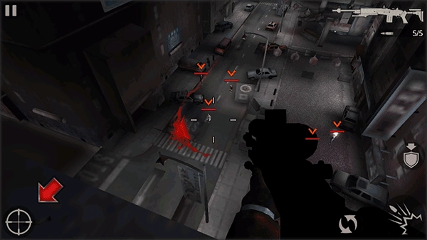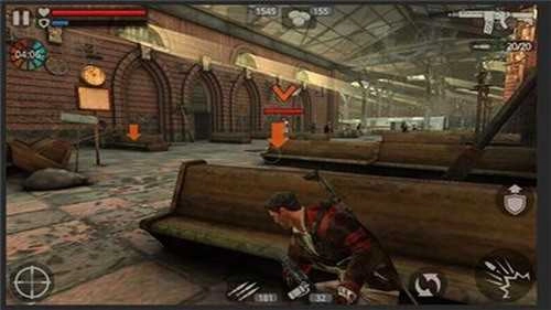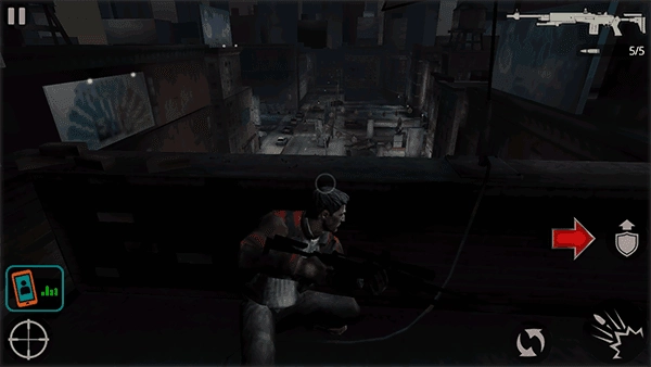 1、游戏开始我们将身处天台上,并在一个掩护的状态。点击右侧的盾牌箭头图标,主角将站起离开掩护。