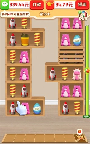 福运货架游戏里面还有另一个奖励的,它是按关数来提现的,比如刚开始时,闯过第一关就能提0.1元,后续闯过50关还有机会再提一次,不过提现是有条件的。在我们闯过50关后,还要累计赚到1000,并且打卡6天,视频等级达到10级才行。
