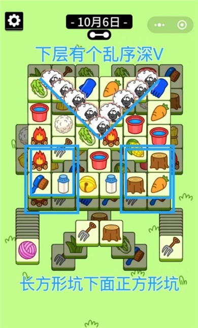 3、要注意的是正V区域的牌需要优先消除,其次是两个正方形,盲盒区和倒V区辅助正V区和方形区。