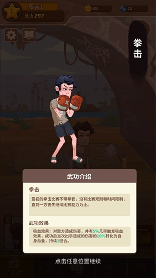 1、首先进入《我不是废柴》这款游戏,你会从废柴身份起步,学习一门功夫,像拳击就可以作为选择之一;