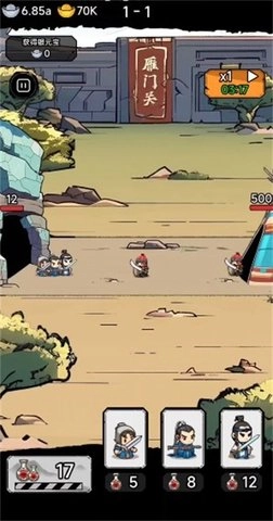 2、通过策略和布局招募士兵,摧毁丐帮的防御塔,最终获得胜利。游戏玩法简单易懂。一键招募士兵参战。