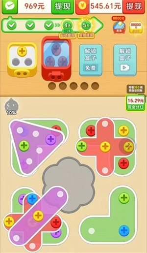 2、消除的螺丝越多奖励越丰富,每次通关都能获得红包。