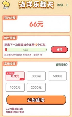 这是骗人的。刚开始的0.3元确实能提现,但之后想再取现,就得连续登录3天,而且每天都得看广告。等你看了几天广告后,取现条件又变成了要达到30级。这等级特别难升,后面看广告升级的进度每次只加0.001%!而且每玩个5次左右消除就得看广告,特别耗时间。光是升级可能就得花一两个月,根本就是在忽悠人。别在这上面浪费时间了。