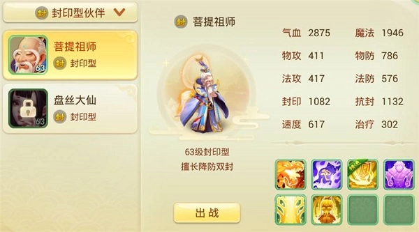 在封印型伙伴的选择上,菩提祖师或者盘丝大仙其实都可以。不过根据技能实用性来看,我个人更推荐菩提祖师。他的被动技能不生不灭可以在复活之后获得一回合的无敌,在PK时这个技能有时可以扭转战局。