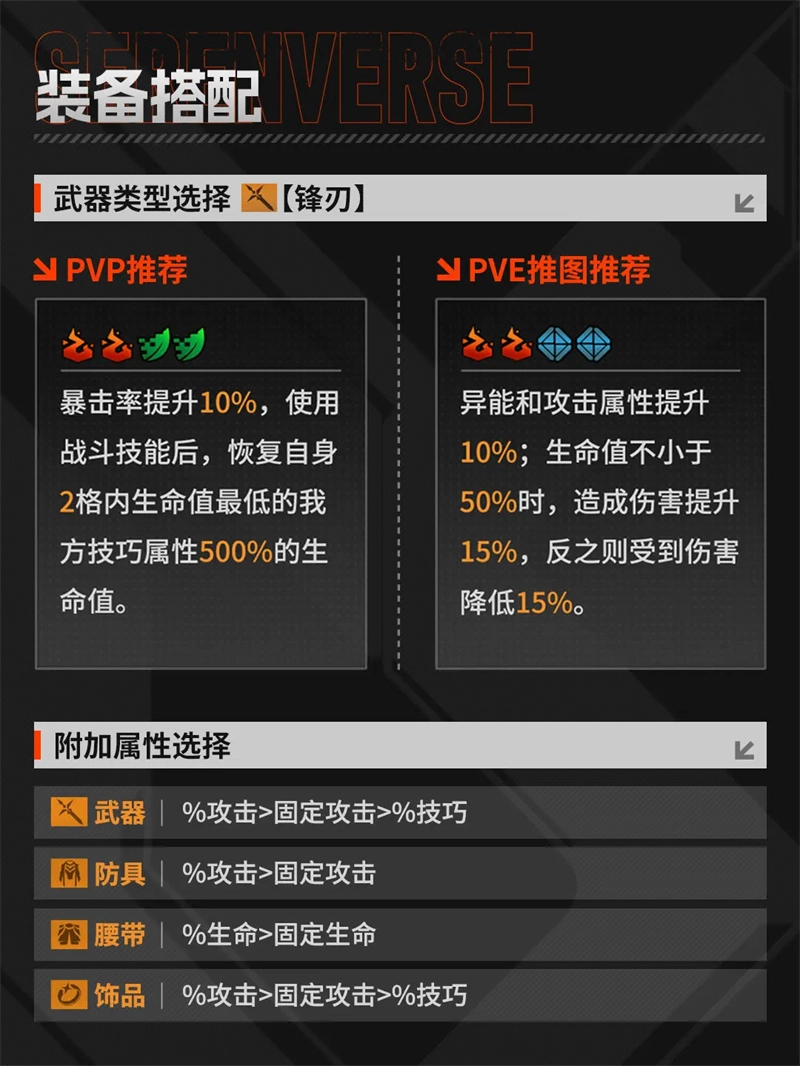 PVE 推图推荐:异能 / 攻击 + 10%;生命≥50% 时伤害 + 15%,反之减伤 15%