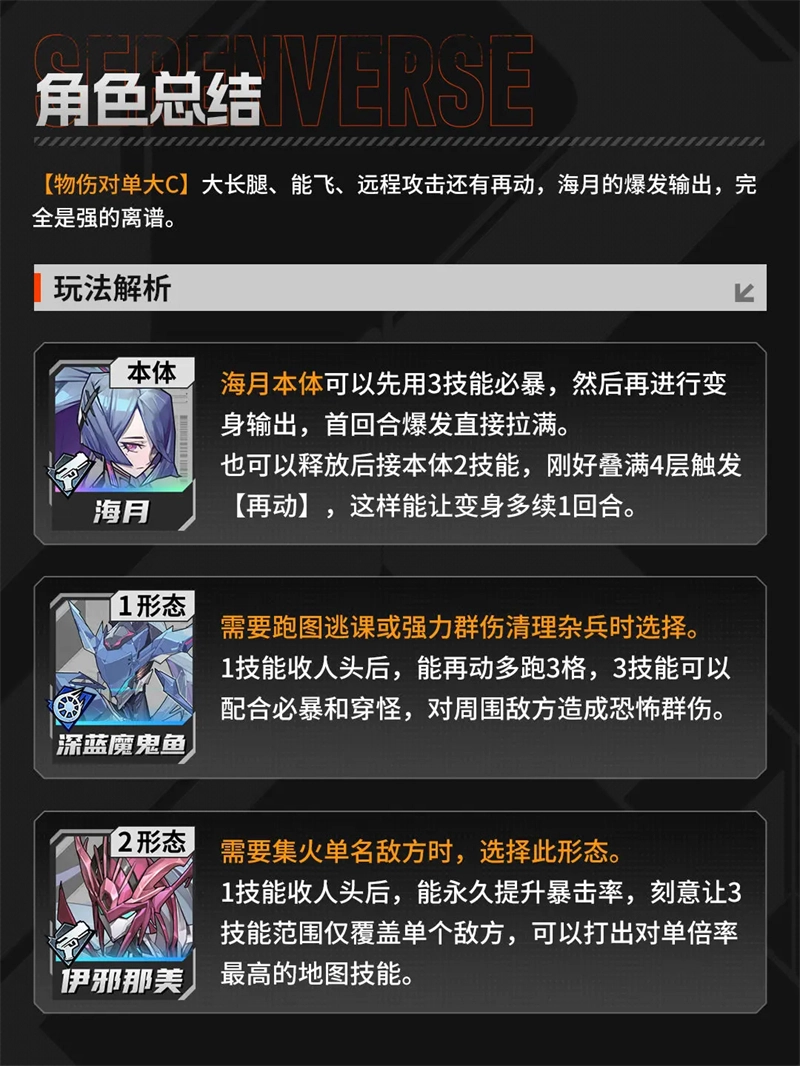 海月是物伤对单大 C,兼具远程攻击、飞行能力与再动机制,爆发输出能力 “强到离谱”,同时拥有双形态适配不同战斗场景。