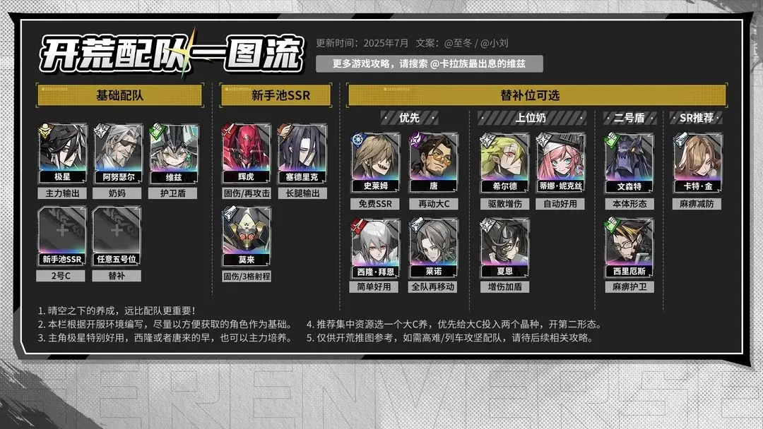 基础配队:由 “极星(主力输出)+ 阿努瑟尔(治疗)+ 维兹(护卫盾)” 组成核心铁三角,再搭配新手池 SSR + 任意五号位,保证输出、生存、防护的基础功能。