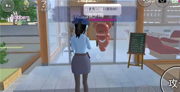 1、在樱花校园模拟器中,玩家换上警服之后,过一会在右上角就会出现任务了,点开任务后会知道强盗熊在抢劫,打败他后就可以获得金钱;