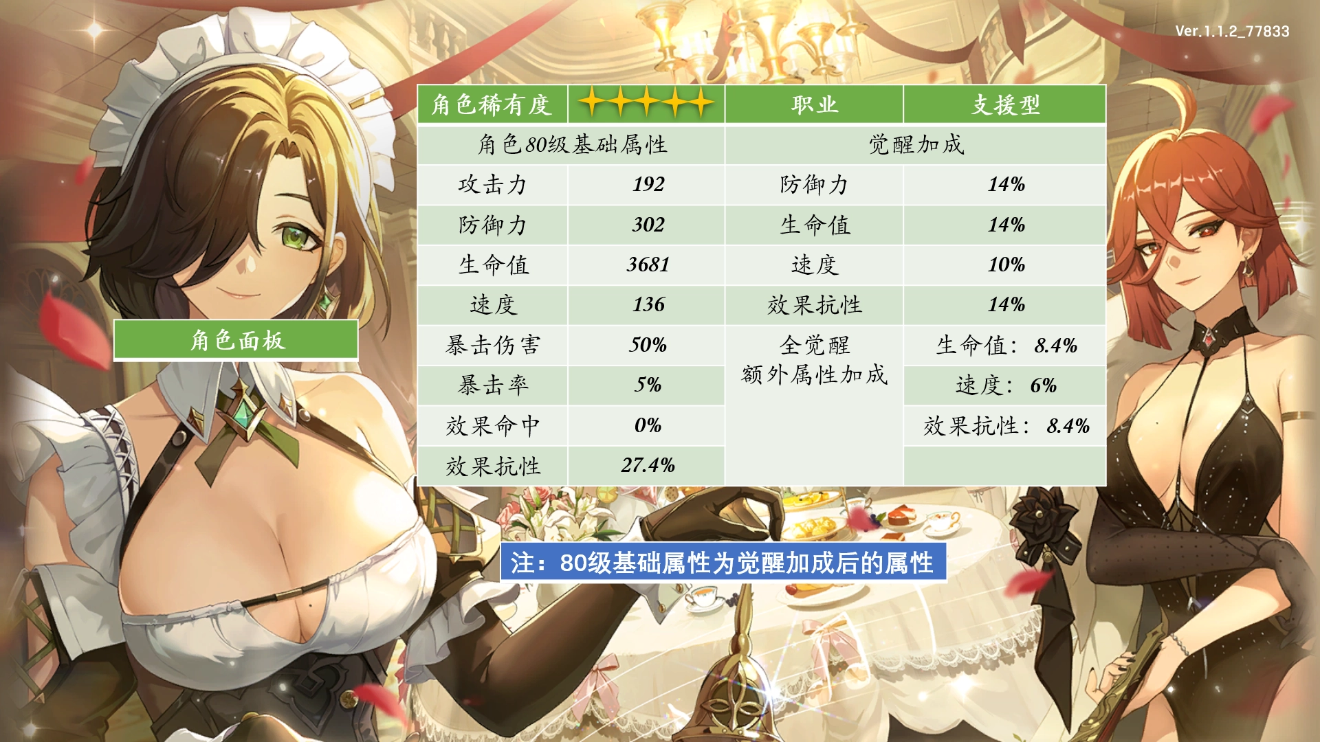 然后我们看一下角色面板,觉醒点满后有136的基础速度,只比暗辅的139速度慢3速,属于最快的那一档了,别的属性抗性给的不少,后续在需要堆抗性的时候有不小帮助。