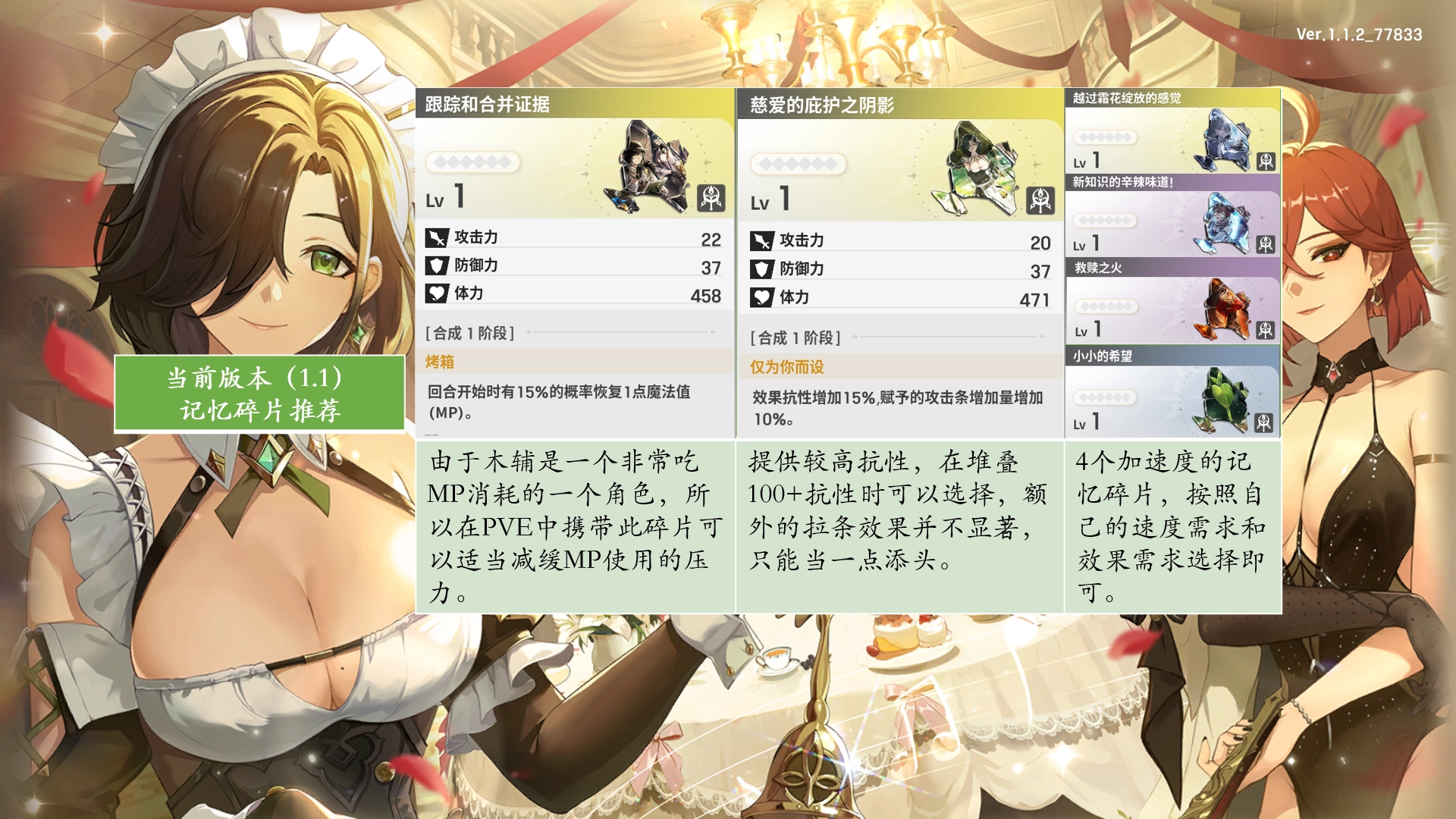 记忆碎片推荐,我建议pve带这个跟踪和合并证据去缓解mp的消耗,自身的伴生记忆碎片,在想要堆抗性的时候也是很好的选择,至于那点拉条其实算是点添头。然后就是各种加速度的记忆碎片,按需装备即可。