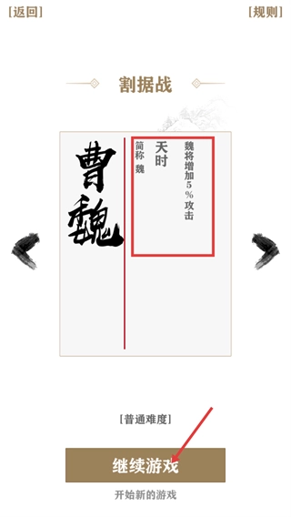 1、【割据战】玩法里,【曹魏】阵营拥有【天时】增益效果——魏将攻击提升5%,当前难度设定为【普通难度】,点击【继续游戏】按钮就能开启该局对战。