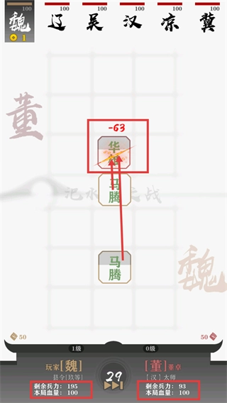 3、对战中【华佗】承受-63伤害,我方【剩余兵力-195】-本局血量-100,敌方董卓剩余兵力-93,依托部署武将推进战局。