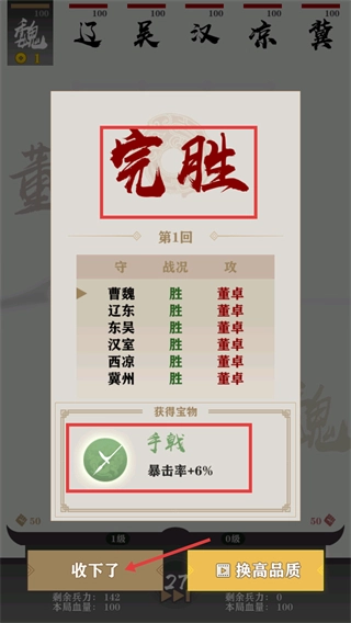 4、【第1回】对战达成【完胜】,可获得宝物【手戟-暴击率+6%】,点击【收下了】即可获取该增益道具。