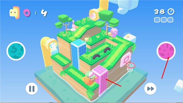 3、进入到关卡里了玩家就需要操作角色来关卡给的任务,点击右手边的粉色小球来让障碍物下降,这样我们就能顺利越过障碍物走到去对面;