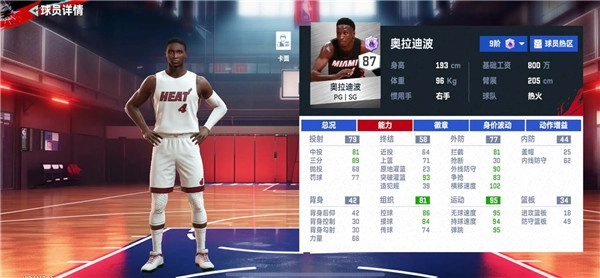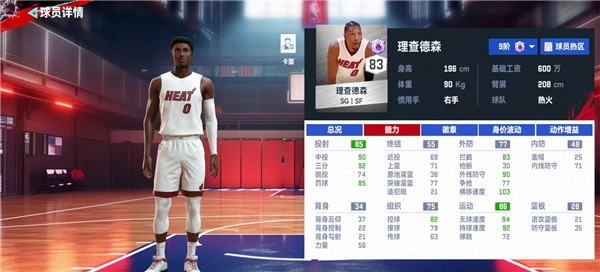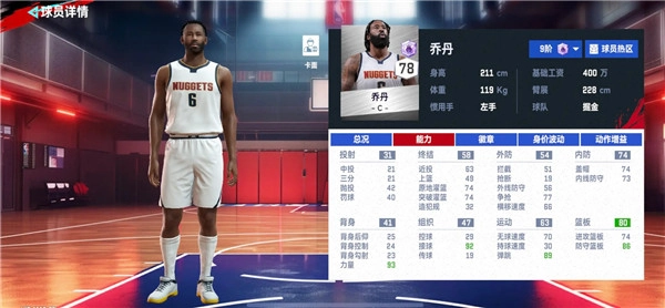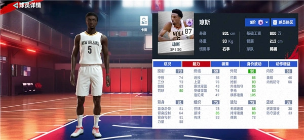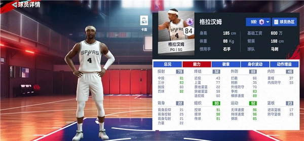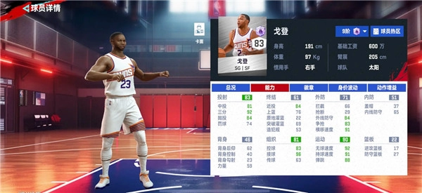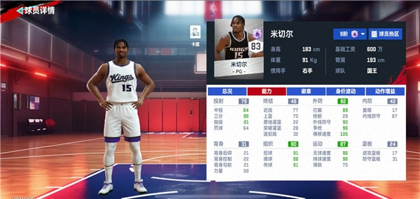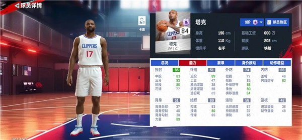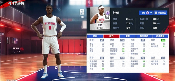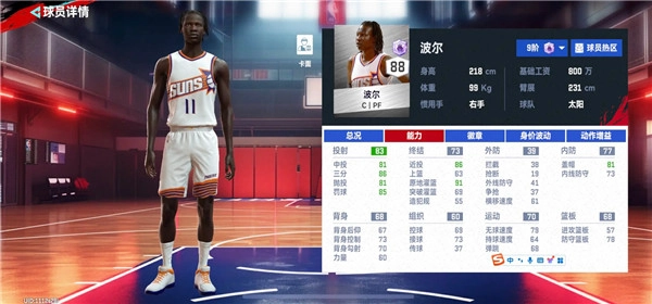 游戏中,投射属性优异,完全可以承担起空间队伍侧翼主力位置。模型和防守属性是他的基本盘。优秀的移速和弹跳,盖帽抢断双修,均为优秀水准!运控能力良好,可以简单持球。