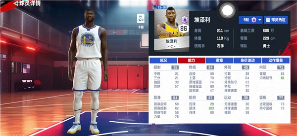 回到巅峰对决,15-16埃泽利,没错..是他的巅峰赛季(虽在nba打的时间很短)。每36分钟15+12+2.3的水准。所以游戏里篮板内防给的很漂亮。