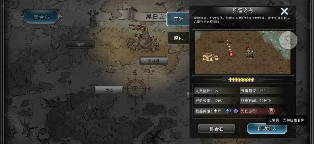 [普通弥留之岛]死亡无惩罚,可放心探索。点击“集合石”选择房间加入,自动加入为随机。