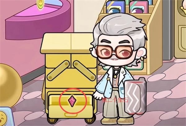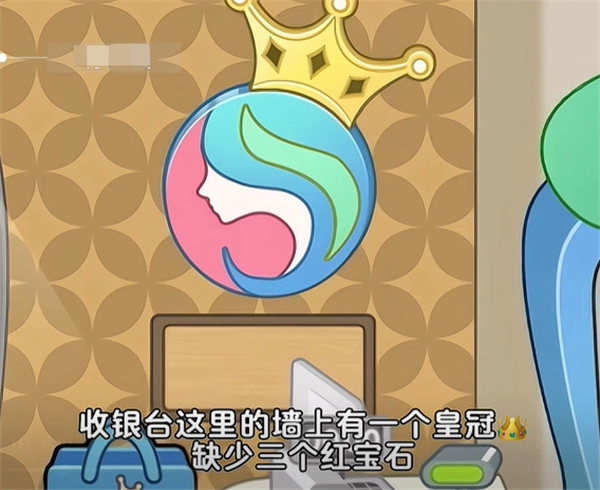 1、首先来到美发沙龙店,收银台这里的墙上有一个皇冠,缺少三个宝石。