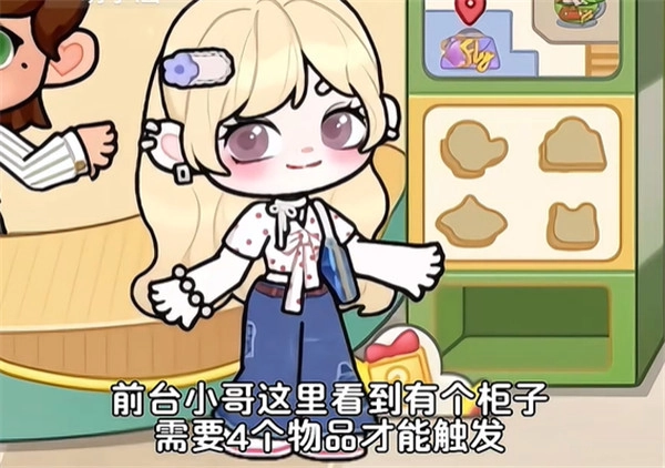 8、接着来到商场一楼,前台小哥这里看到有个柜子需要4个物品才能触发。
