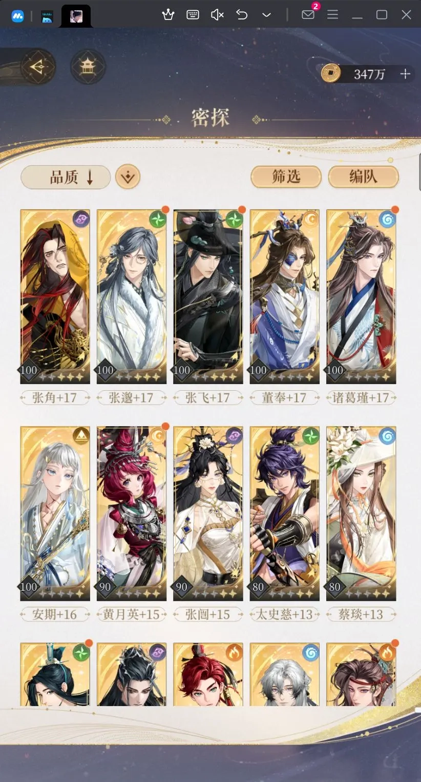 人权卡就那几张,大部分时间都是上同样的颜良狮子喵陈登,只要抽到徐庶或者张角其中一个再加上张飞张邈,就能打大部分关卡了,比起某些不断出新人权的游戏来说好不少。