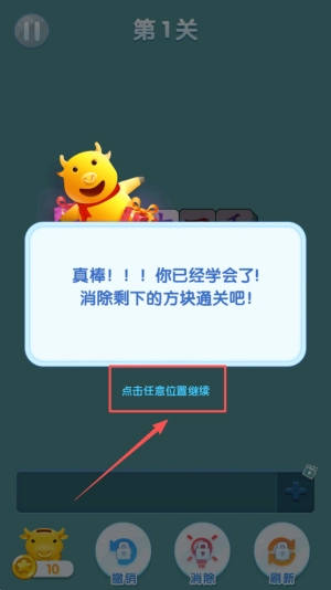 4、通关继续:在真棒提示界面点击任意位置,使用消除功能清除剩余方块完成第1关。