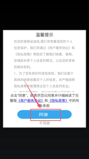 1、进入游戏:第一步是打开隐私政策界面,点击同意后即可进入游戏主界面。