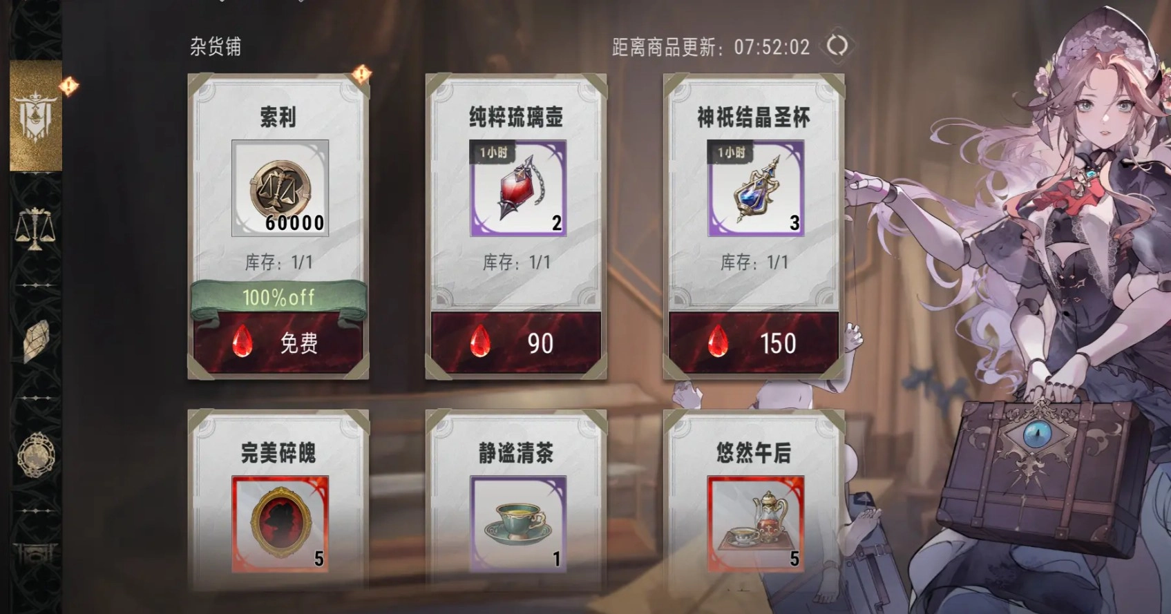 杂货铺:通过钻石、索利(摩拉/铜币)购买,可购买血缘亲和物品、碎魂、索利、钻石