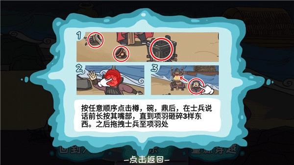 按任意顺序点击樽,碗,鼎后,在士兵说话前长按去嘴部,直到项羽砸碎3样东西。之后拖拽士兵至项羽处即可通关