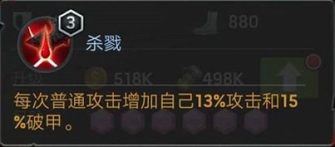 三技能“杀戮”每次普通攻击增加13%攻击力与15%破甲,效果可叠加并持续至战斗结束。屠夫若持续输出,将可能达到无限叠加的高攻。