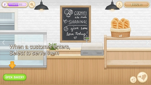 7、面包烘焙完成后,快去面包店,将它们放到橱窗里出售,点击“open bakery”。