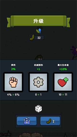4、当波浪结束后,你将获得一次技能升级的机会,这些升级选项是随机生成的,你也可以消耗泡菜来刷新选项,从而挑选出自己心仪的技能。