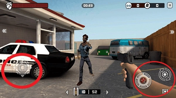 玩家在进入关卡之后就可以开始闯关,屏幕左边是控制人物移动的按钮,屏幕右边是攻击、换弹、换武器按钮,控制人物击败丧尸即可过关。