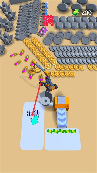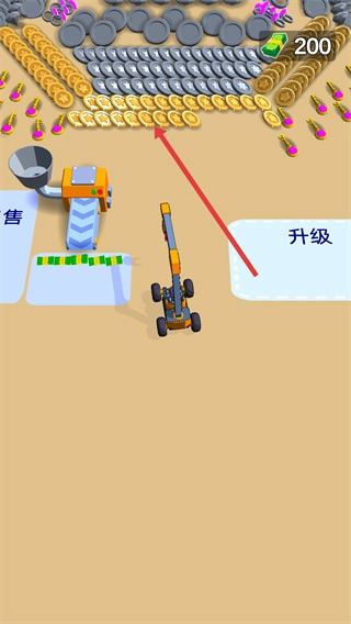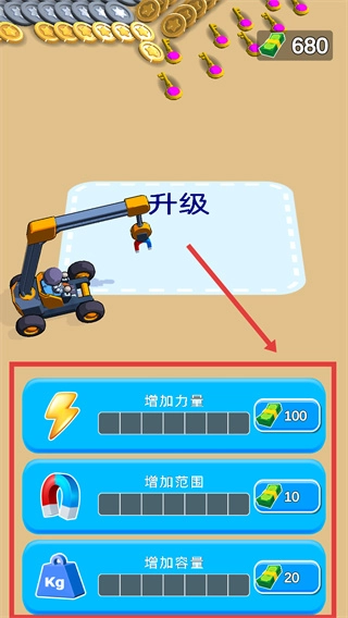 1、控制挖掘机来抓取各种金币和物品来获得资源;