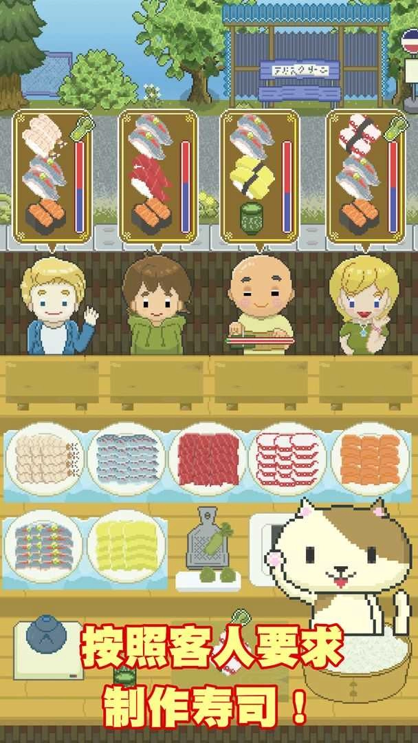 玩法是每天玩家自己制作寿司然后出售给来店里的客人,而寿司的材料不是靠买的,是靠去海里钓鱼换来的原材料,除此之外随着天数的进行慢慢的会解锁很多的剧情