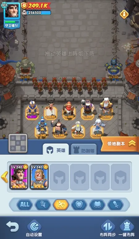 九位英雄,推荐首要安排推墙效果的英雄,并上阵两位单体英雄专攻精英怪及BOSS、三位群攻英雄清理小怪,以及一位阻挡英雄提供阻挡效果,最后根据具体情况上阵增/减益or控制属性英雄;