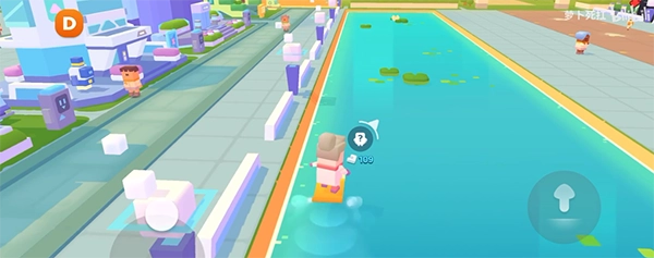5、我们继续跟着提示来完成剧情,在路经水湖的时候可以开启滑板在水面上行动;