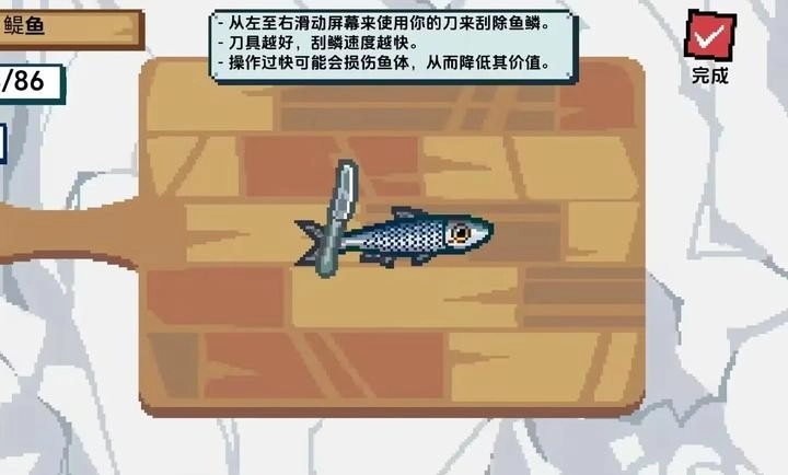 2、将鱼放在案板上,用旁边的小刀给鱼刮鱼鳞,红色的小点点就是鱼鳞,完成后就可以按下右上角的按钮