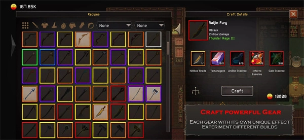2、从怪物身上收集材料,在铁匠铺制造武器、盔甲和神器提升实力。